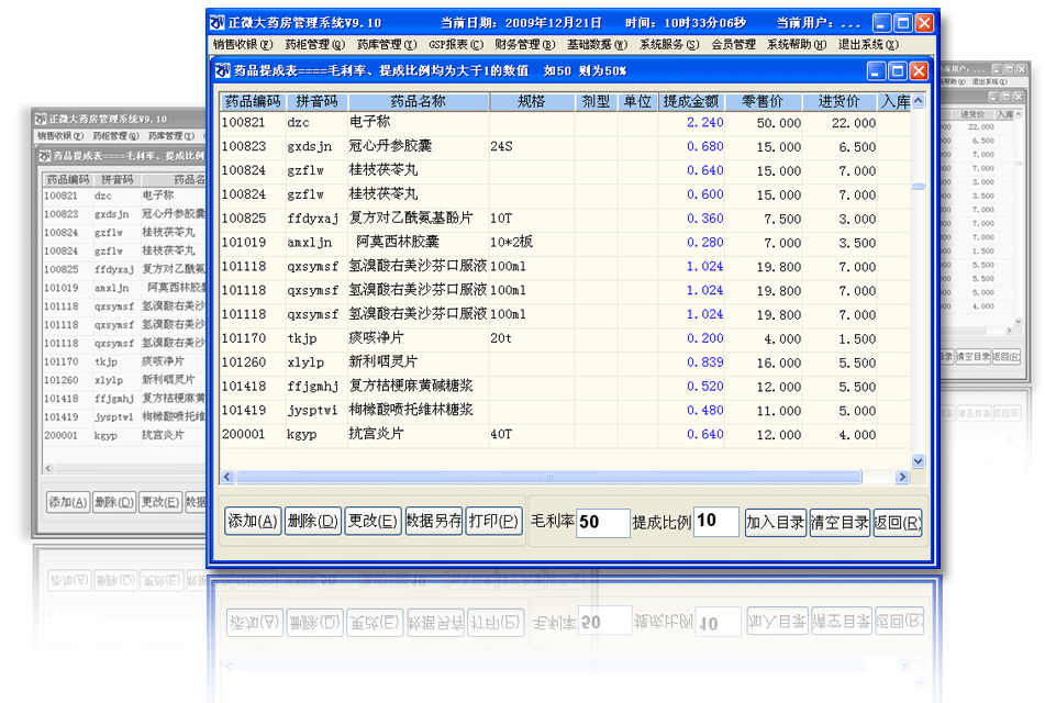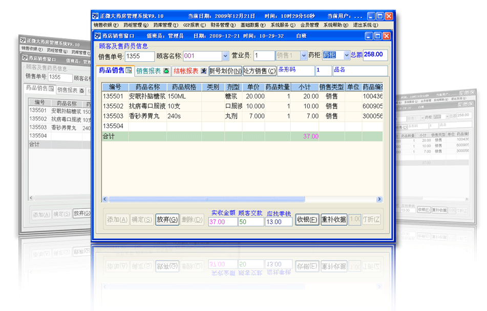 1、集成GSP认证的各项报表,帮助您通过GSP认证; 2、药品进货、库存、销售管理; 3、销售开单、进货入库等模块,方便输入,不需要强行记忆编号; 4、药品报损、退货、退单、调价; 5、药品销售即时利润,可按任一时间段、供货商,药品种类等条件进行复合查询;
